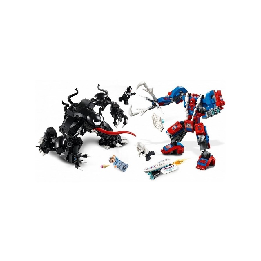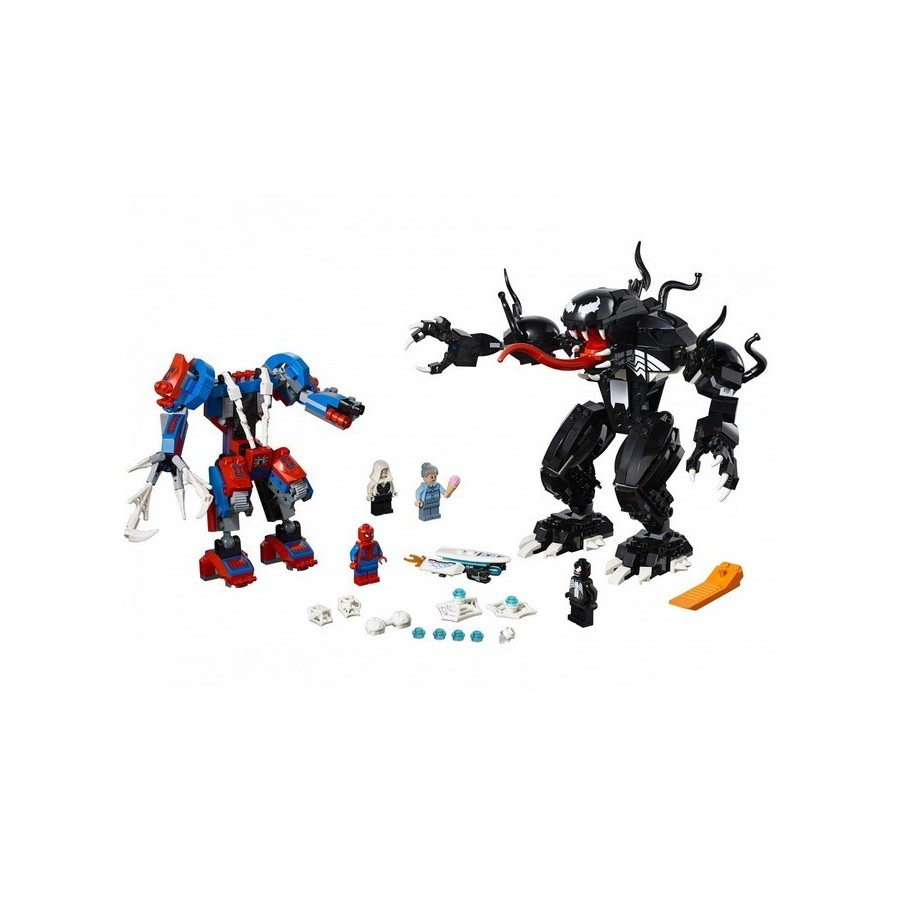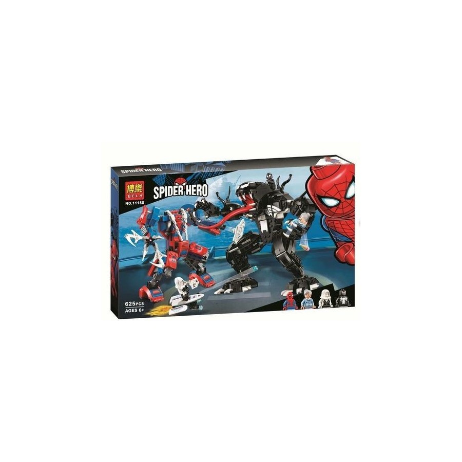 Перед вами роботы Венома и Человека-паука. Человек-паук выполнен в красно-синих цветах. На конце его левой руки крепится бластер, а правой герой может хватать врага. Робот надёжно стоит на устойчивых ногах, а его конечности подвижны, благодаря чему он может принимать разные позы. Человек-паук может сидеть в кабине, прикрепясь из суперпрочной паутиной. Бластер стреляет и пулями, и паутиной.